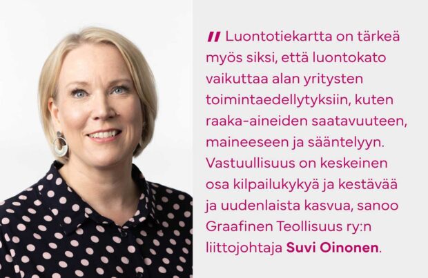 ”Ala tunnistaa vastuunsa ja yhteiskunnallisen vaikuttamisen mahdollisuutensa luontokadon pysäyttämisessä. Luontotiekartan laatiminen oli tärkeä askel alan ympäristövastuullisuuden kehittämisessä. Tiekartta on tärkeä myös siksi, että luontokato vaikuttaa alan yritysten toimintaedellytyksiin, kuten raaka-aineiden saatavuuteen, maineeseen ja sääntelyyn. Vastuullisuus on keskeinen osa kilpailukykyä ja kestävää ja uudenlaista kasvua”, toteaa Medialiiton toimialajohtaja ja Graafinen Teollisuus ry:n liittojohtaja Suvi Oinonen.