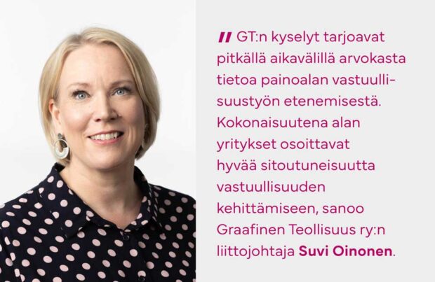 – Graafinen Teollisuus ry:n kyselyt tarjoavat pitkällä aikavälillä arvokasta tietoa painoalan vastuullisuustyön etenemisestä. Kokonaisuutena alan yritykset osoittavat hyvää sitoutuneisuutta vastuullisuuden kehittämiseen, toteaa liittojohtaja Oinonen.